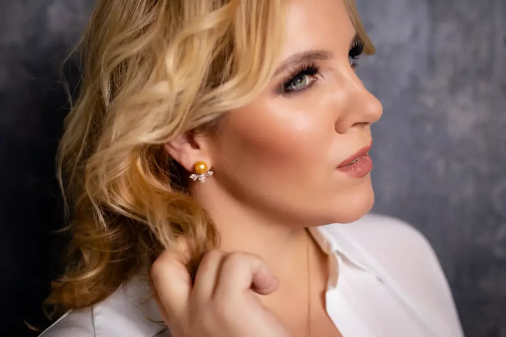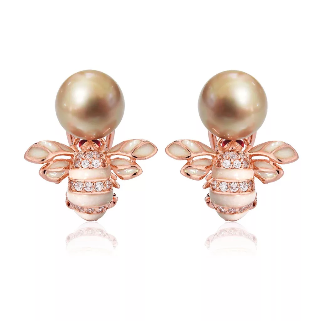 Egyedi, kézzel készült rozé aranyozott ezüst (925 sterling) fülbevaló. Édesvízi gyöngy, zománc és cirkónia díszítéssel, certificate-tel.