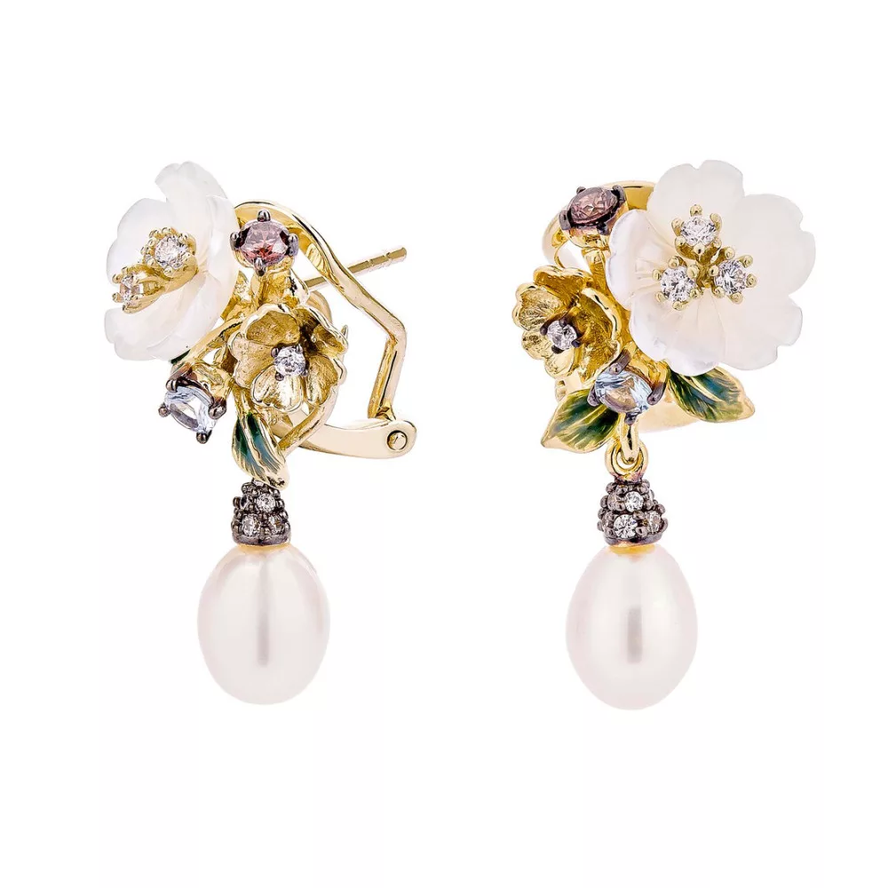 Egyedi, kézzel készült, aranyozott ezüst (925 sterling) fülbevaló. Cirkónia, gyöngyház, édesvízi gyöngy és zománc díszítéssel, certificate-tel.