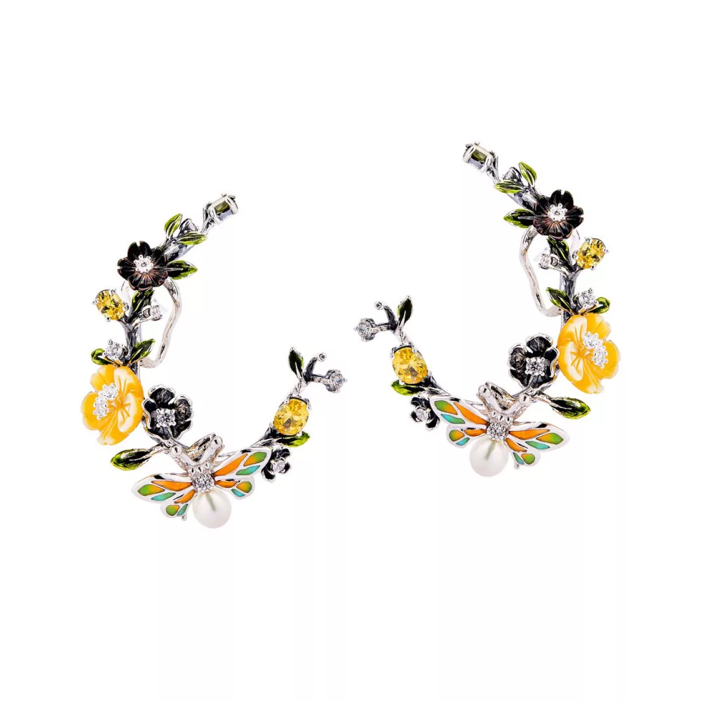Egyedi, kézzel készült, antikolt ezüst (925 sterling) fülbevaló. Cirkónia, gyöngyház, édesvízi gyöngy és zománc díszítéssel, certificate-tel.