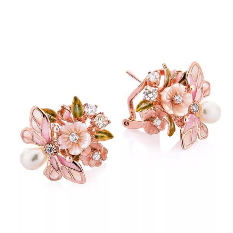 Egyedi, kézzel készült, rozé aranyozott ezüst (925 sterling) fülbevaló. Cirkónia, édesvízi gyöngy, zománc és gyöngyház díszítéssel, certificate-tel.