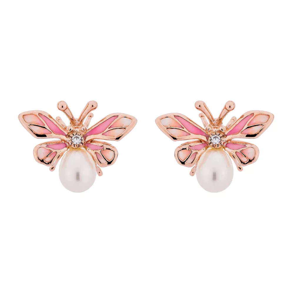 Egyedi, kézzel készült, rozé aranyozott ezüst (925 sterling) fülbevaló. Cirkónia, édesvízi gyöngy és zománc díszítéssel, certificate-tel.