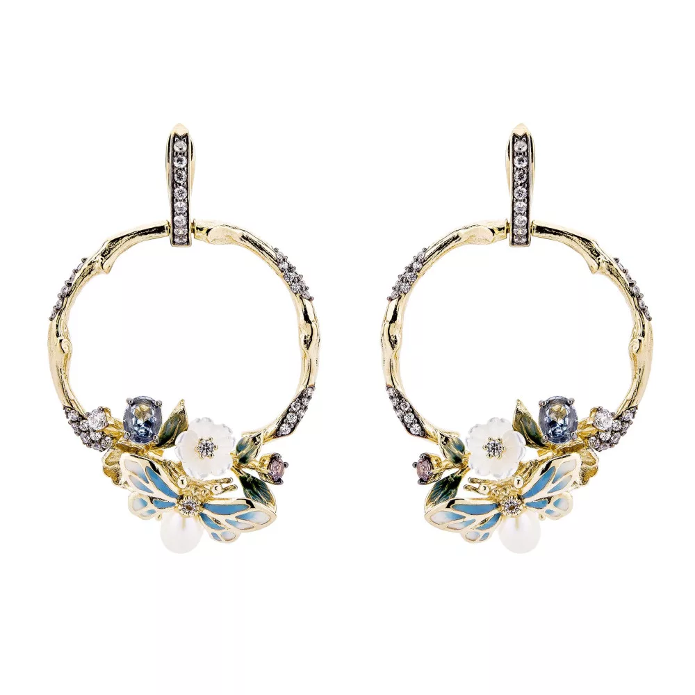 Egyedi, kézzel készült, aranyozott ezüst (925 sterling) fülbevaló. Antikolt ezüst, gyöngyház, édesvízi gyöngy, cirkónia és zománc díszítéssel, certificate-tel.