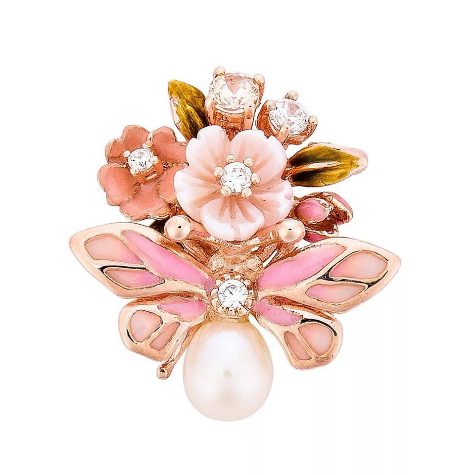Egyedi, kézzel készült, rozé aranyozott ezüst (925 sterling) medál. Édesvízi gyöngy, cirkónia, zománc és gyöngyház díszítéssel, certificate-tel.