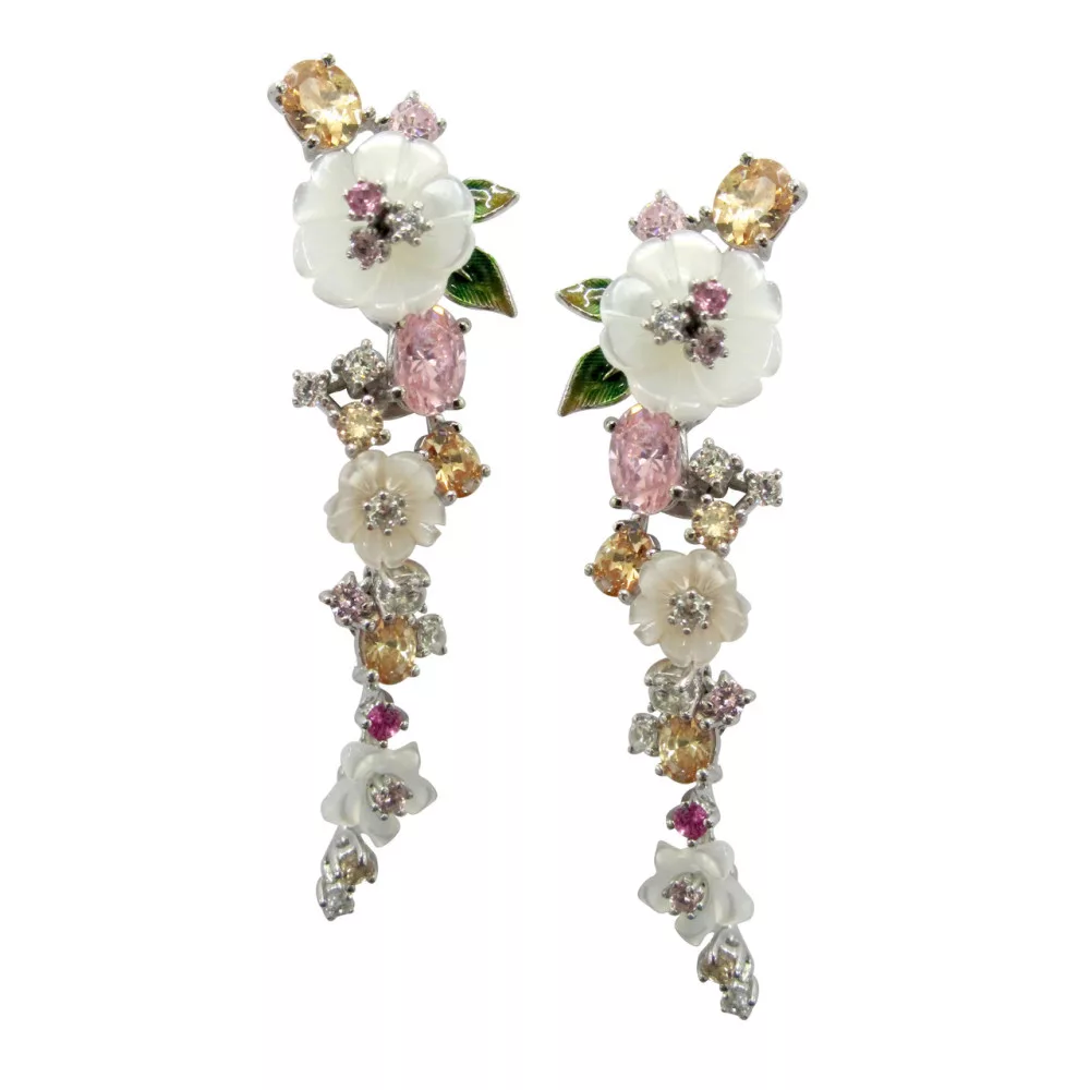Egyedi, kézzel készült, ródiumozott ezüst (925 sterling) fülbevaló. Cirkónia, gyöngyház és zománc díszítéssel, certificate-tel.