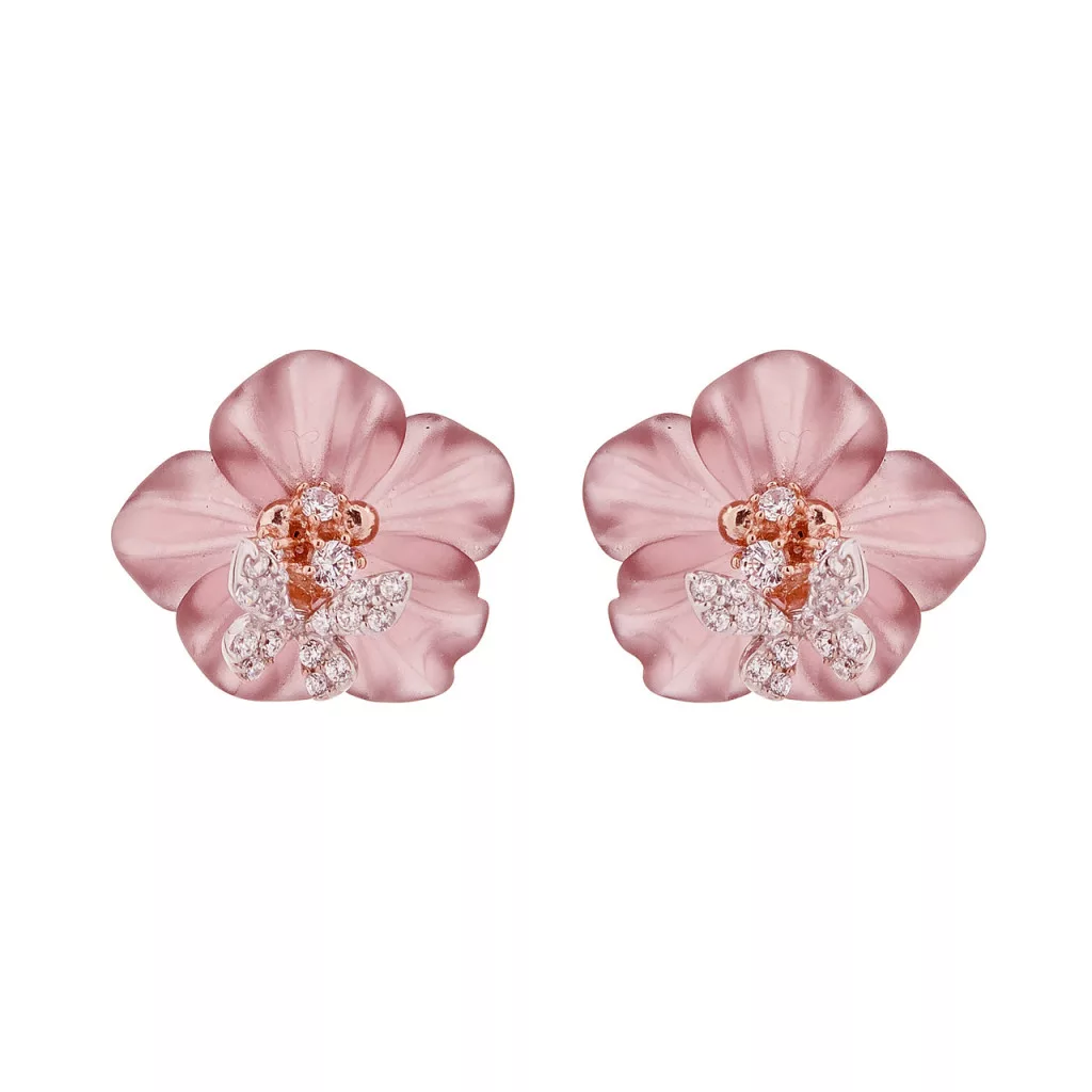 Egyedi, kézzel készült, rozé ranyozott ezüst (925 sterling) fülbevaló. Cirkónia és rózsakvarc díszítéssel, certificate-tel.