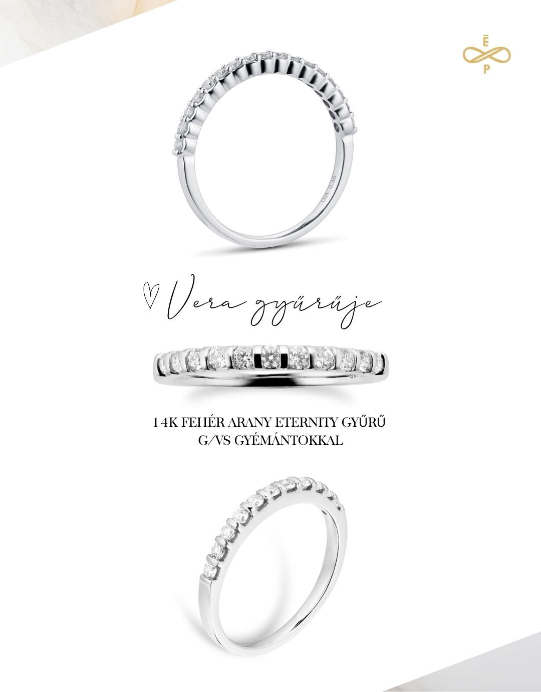 határozott elképzeléssel nyúlt a bandringek felé, mindenképpen egy vékony gyűrűt szeretett volna, melyet kényelmesen viselhet az eljegyzési gyűrűje mellett, ami történetesen szintén egy Ékszerpalota modell: BRK-145. A választása egy half eternity gyűrűre (félig köves bandring) esett, fehér arany színben, amely 14K aranyból készült és 0.03ct G/VS gyémántokkal van foglalva.