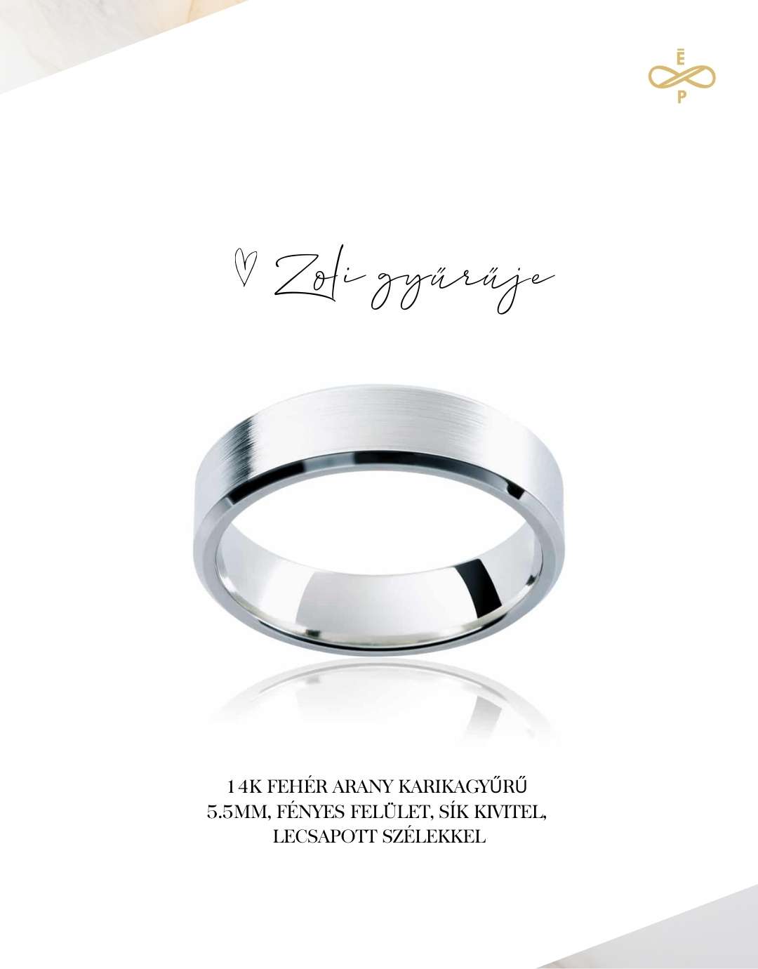 gyűrűjének megtalálásában kollégáink segítettek. Választása egy letisztult, klasszikus gyűrűre esett, melynek férfiasságát a szélessége, anyagvastagsága és sík profilja adja. A klasszikusságát moderné teszi a gyűrű két szélének “lecsapása”.